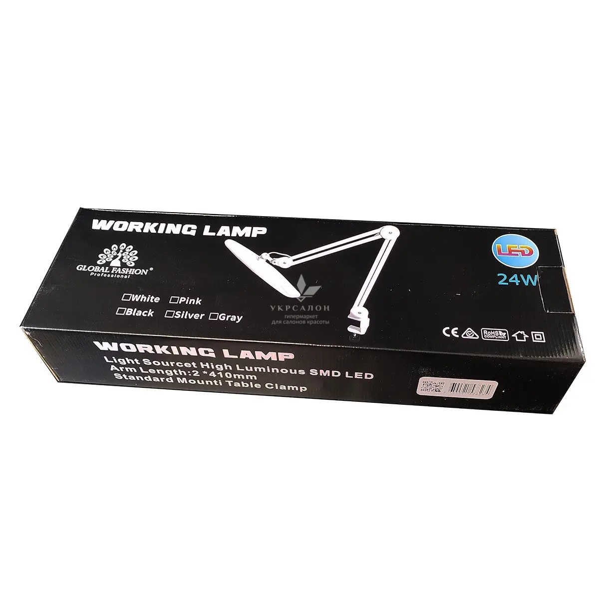 Настільна LED-лампа Global Fashion потужністю 24 Вт створена для рівного та комфортного освітлення робочого місця б'юті-майстра. Модель фіксується на струбціні та підходить для більшості столів, забезпечуючи стійке кріплення без зменшення корисної площі. Регульований штатив-пантограф дозволяє змінювати висоту та положення плафона, а шарнірне кріплення з поворотом на 360° допомагає точно спрямовувати світло у робочу зону.