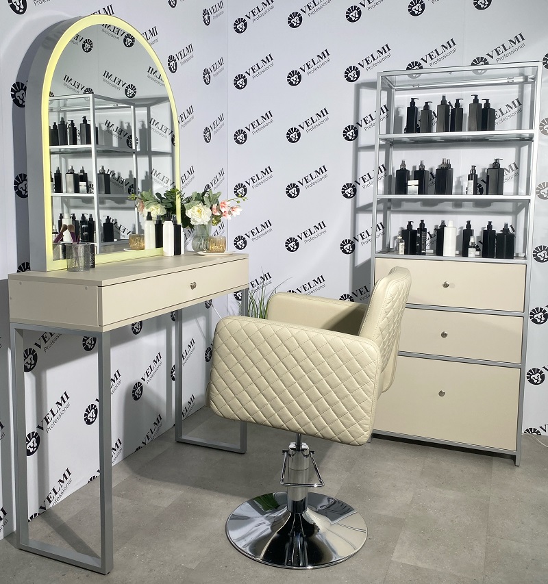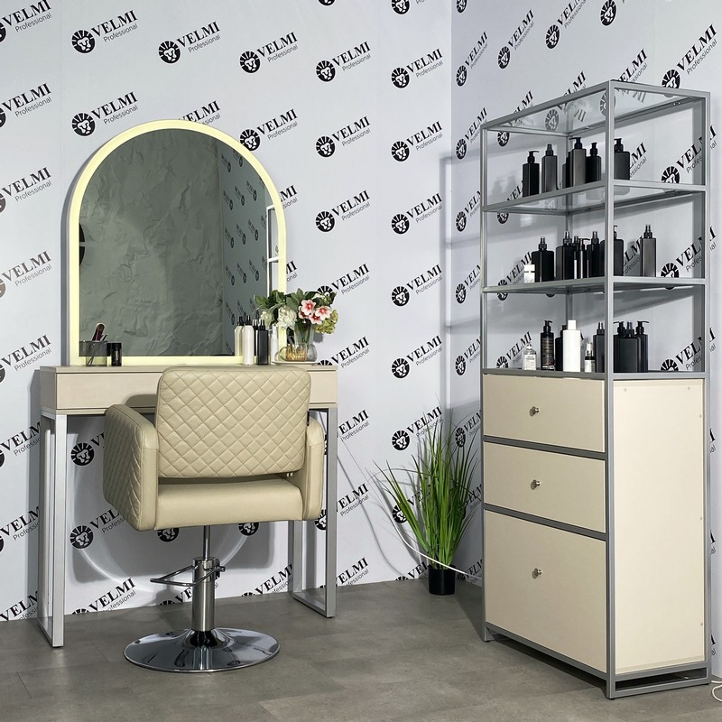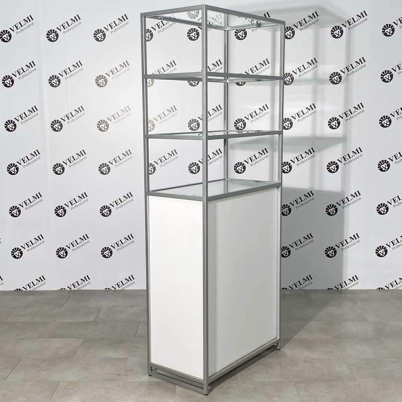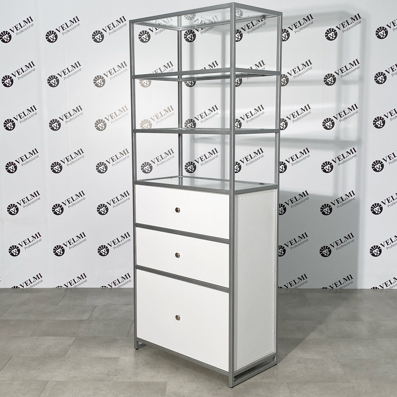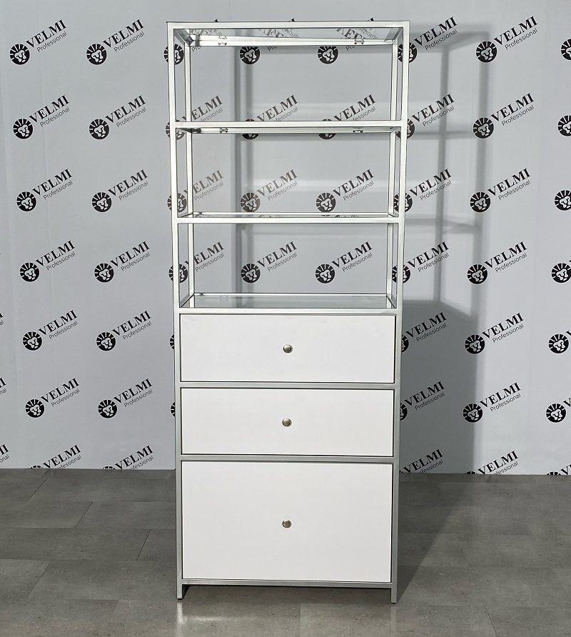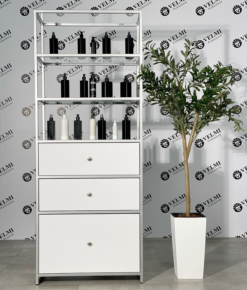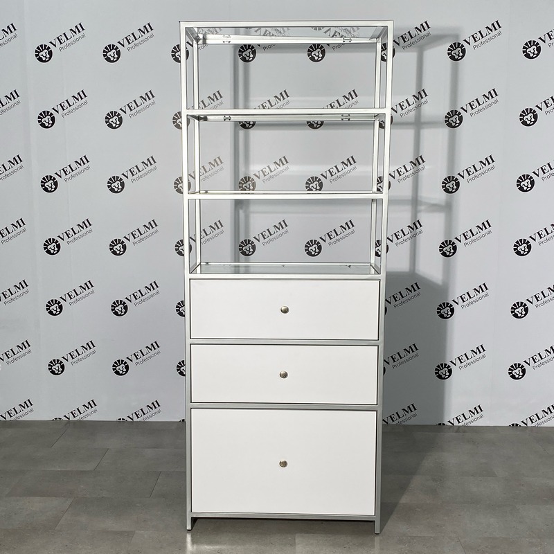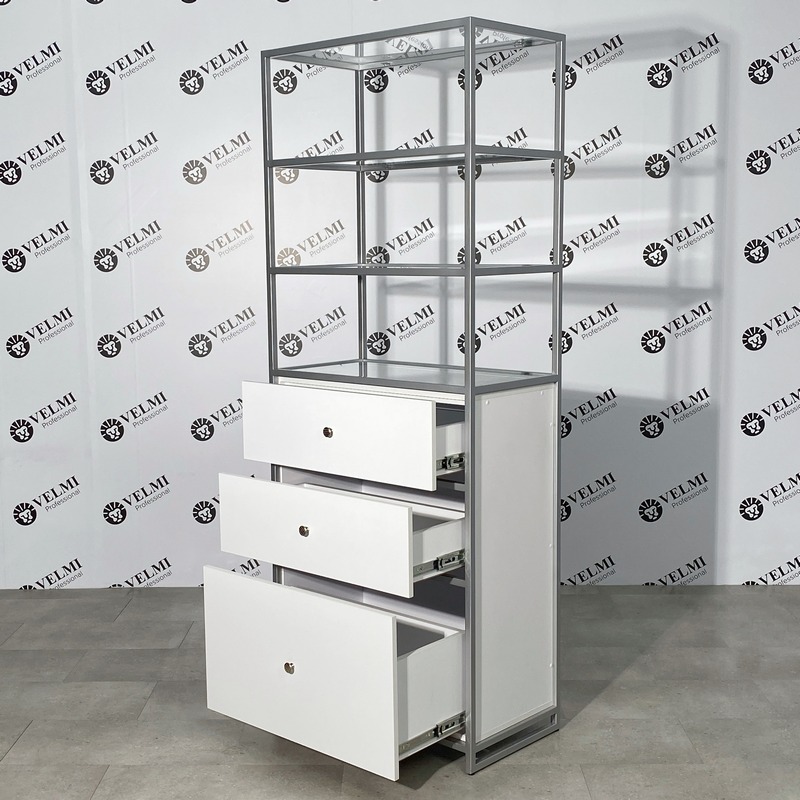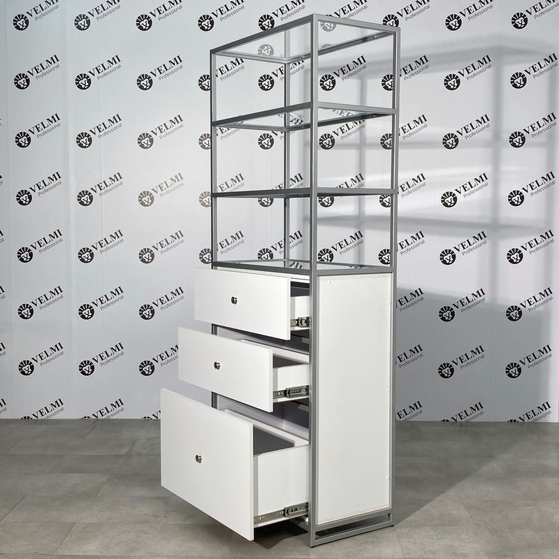 Витрина для салона красоты Iris — практичное решение для оформления торговой зоны и аккуратной презентации продукции в салоне. Модель подходит для размещения косметики, уходовых средств и аксессуаров, помогая сделать ассортимент более заметным для клиентов и способствуя увеличению дополнительных продаж. Открытая конструкция с четырьмя полками обеспечивает хороший обзор товаров и удобный доступ как для посетителей, так и для администратора. Стеклянные полки легко очищаются и подходят для регулярной дезинфекции, что особенно важно для салонного пространства. В нижней части расположены три выдвижных ящика на телескопических направляющих, которые удобно использовать для хранения запасов, расходных материалов, инструментов и сопутствующей продукции. Металлический каркас с порошковым покрытием рассчитан на активную ежедневную эксплуатацию, отличается прочностью и устойчивостью к износу и коррозии.