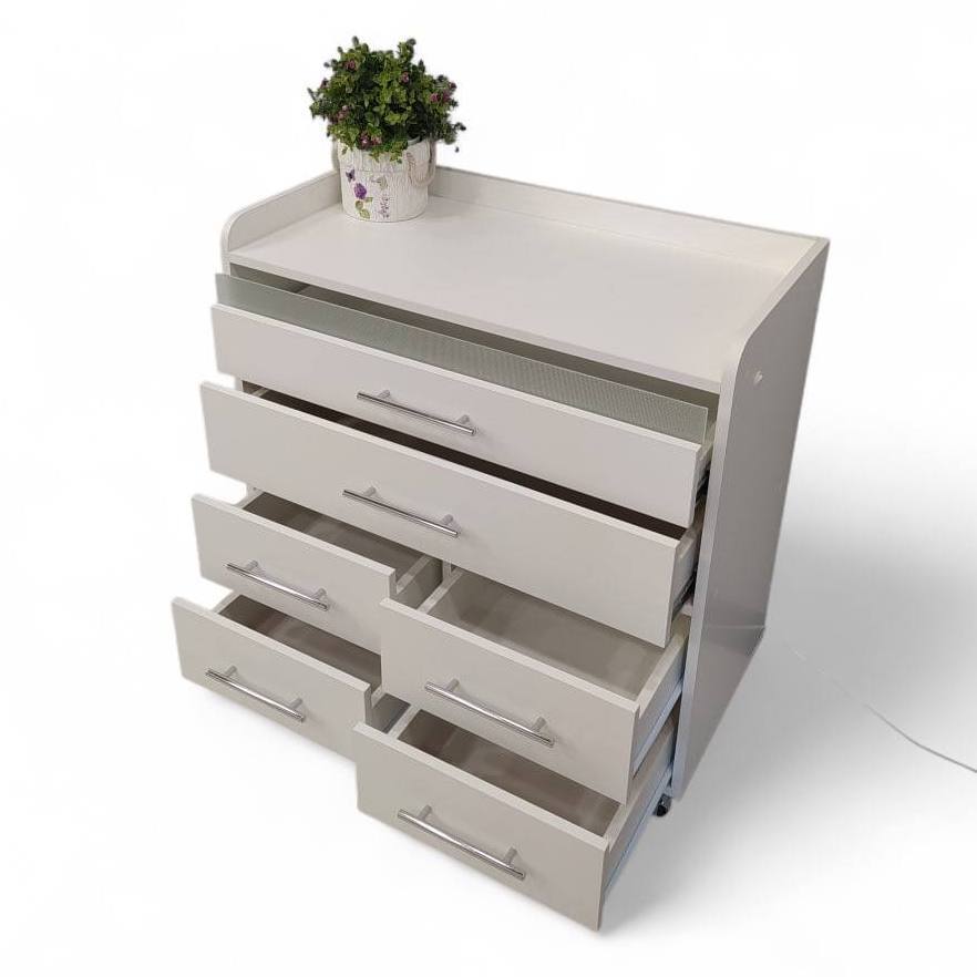 Металлические рейлинг ручки придают тумбе современный внешний вид и делают её более износостойкой. Колеса с фиксаторами позволяют свободно перемещать изделие по салону и надежно фиксировать его на месте при работе.