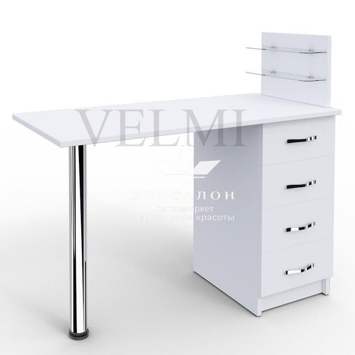 Стол оснащен четыремя выдвижными ящиками, а также надстройкой для хранения лаков с двумя стеклянными полочками. Стол выполнен из качественного и практичного ДСП 18 мм, торцы обработаны пластиковой противоударной кромкой. На ящики установлены телескопические направляющие полного выдвижения. С одной стороны стола - хромированная ножка. Стол может быть, как правосторонний, так и левосторонний.