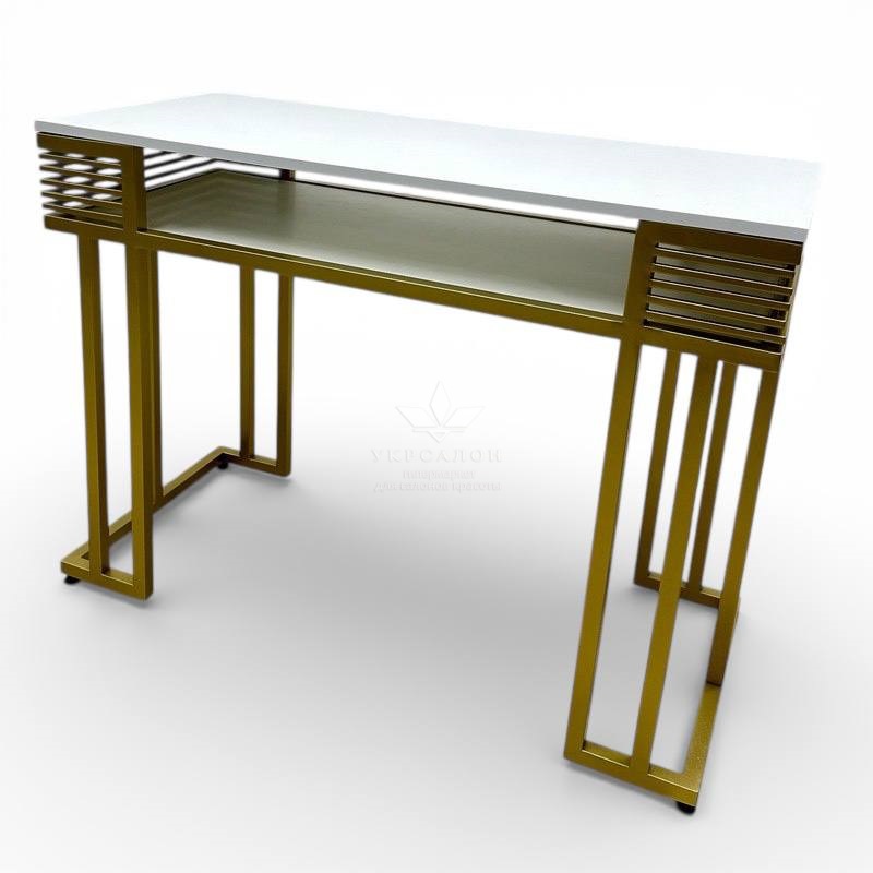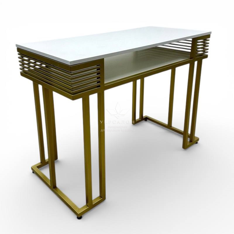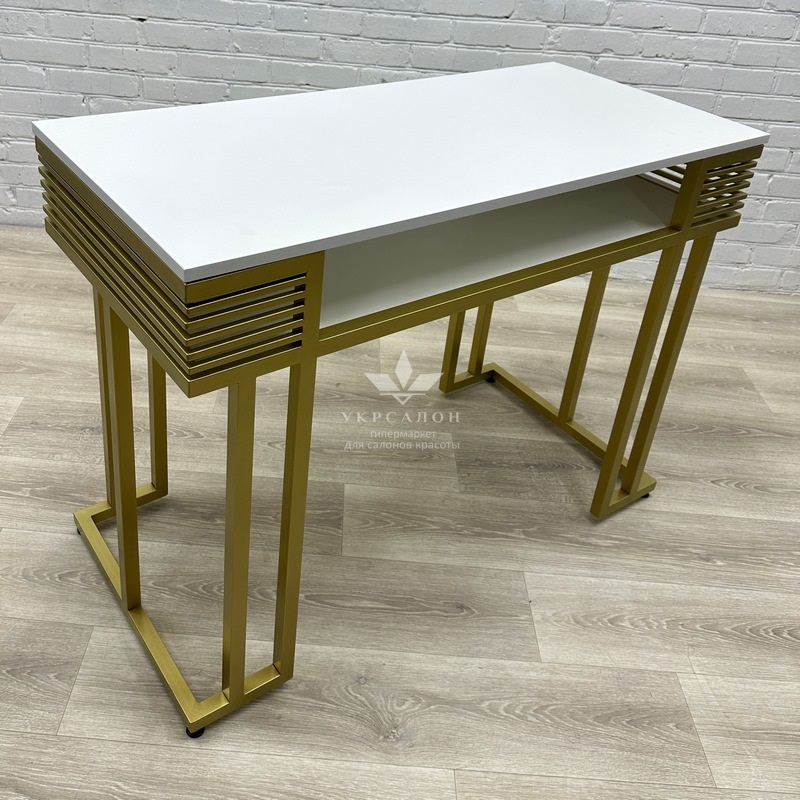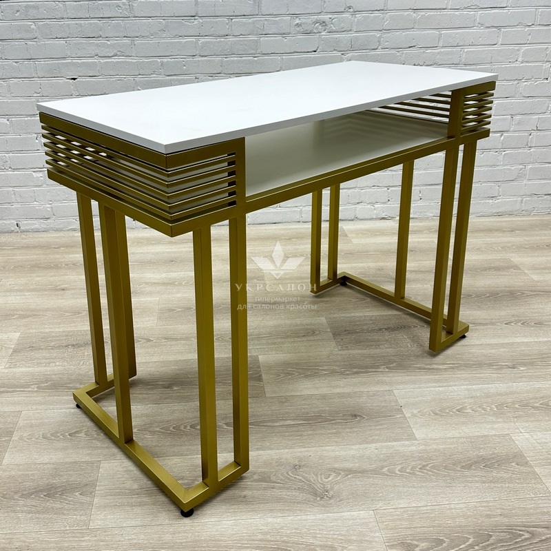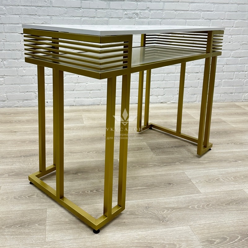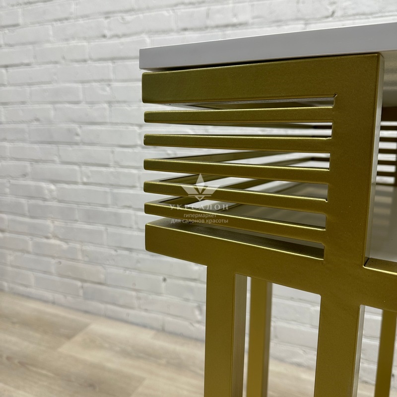 - премиальный дизайн: золотой металлический каркас в сочетании с белой столешницей создает выразительный и статусный внешний вид;