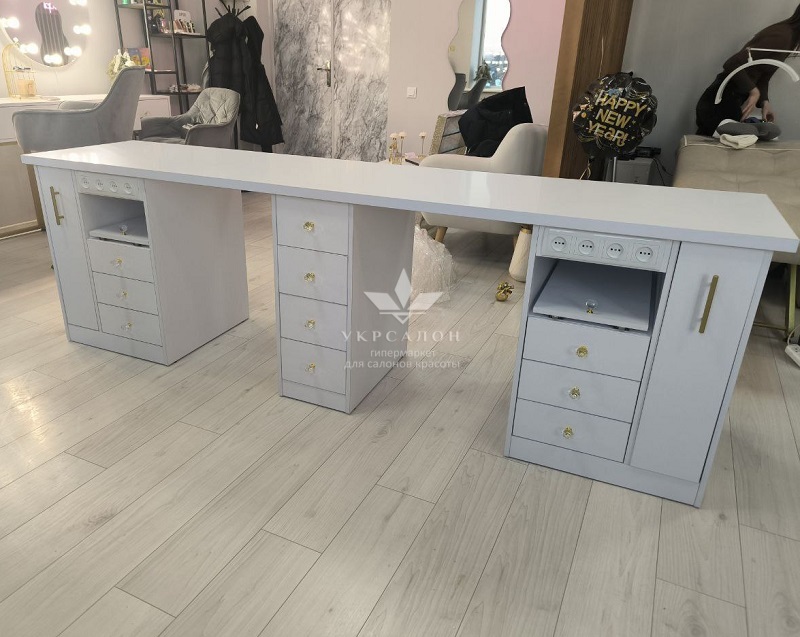Манікюрний стіл Tertio ArtNailCargo на два майстри – двомісний манікюрний стіл для салонів, де важлива акуратність на робочому місці та зручне підключення обладнання. Продумана система зберігання (ящики, полиці та карго) дозволяє тримати розхідники та інструменти у швидкому доступі, а вбудовані розетки спрощують роботу з лампами, фрезерами та витяжками.