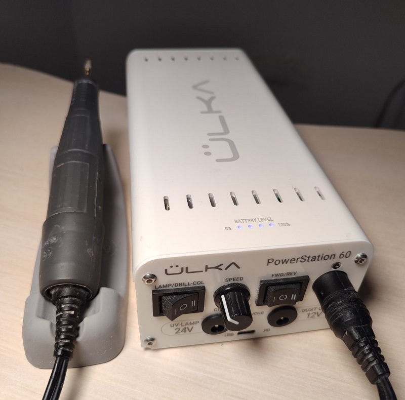 ÜLKA PowerStation 60 — идеальный помощник для тех, кто ценит мобильность и непрерывность в работе. Благодаря возможности подключать все необходимые инструменты одновременно — вытяжку, ручку-фрезер, УФ-лампу и другие устройства — вы можете работать даже без доступа к электросети.