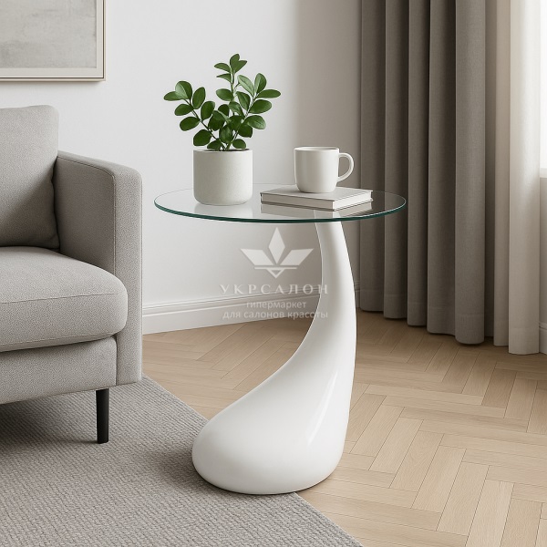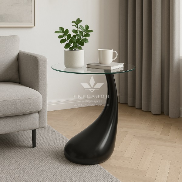 Столик для клиентов Perla — изящное решение для салонов красоты, лаунж-зон и шоурумов. Круглая столешница из прозрачного закалённого стекла придаёт конструкции лёгкость, а декоративная ножка каплевидной формы из полипропилена становится выразительным элементом современного интерьера.