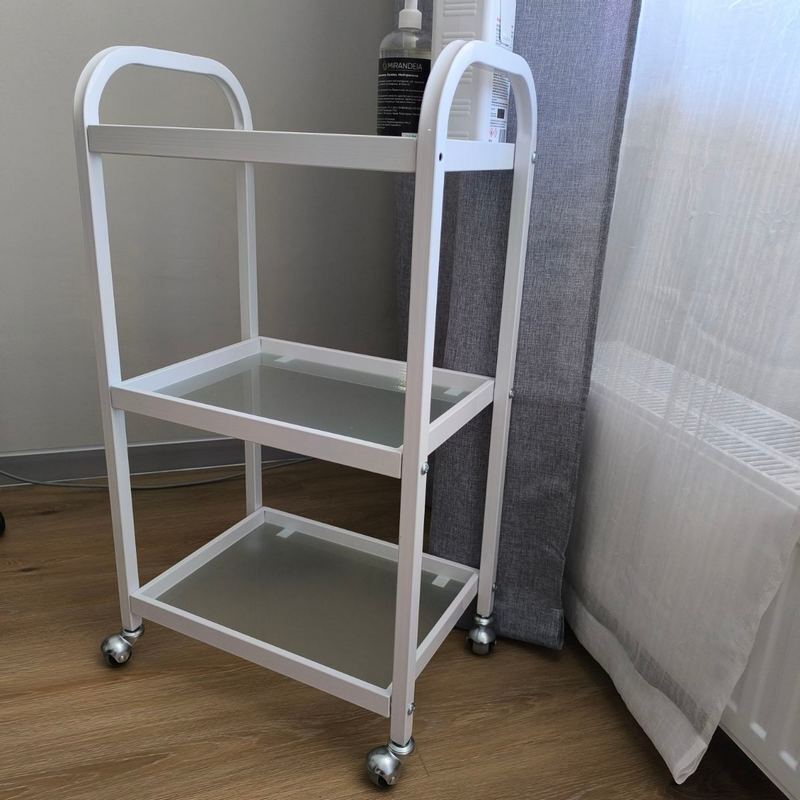 Тележка оснащена тремя полочками и удобными колесиками для комфортного перемещения по полу.
